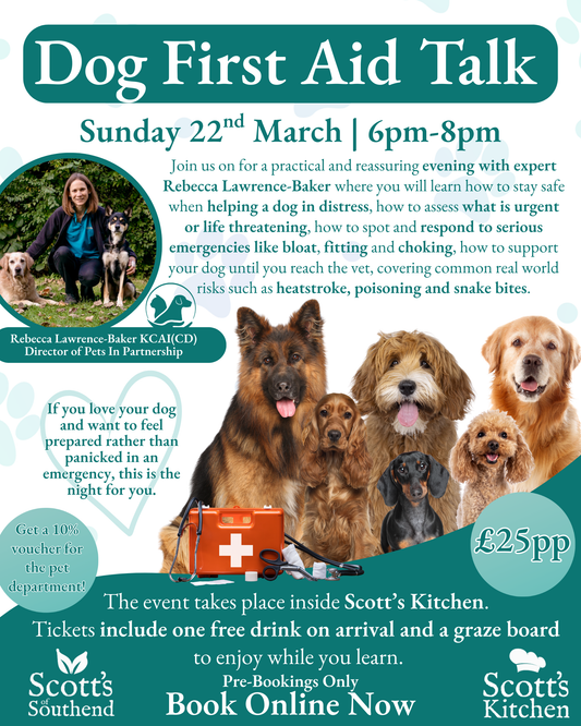 Join us on 22nd March, 6pm–8pm for an essential Dog First Aid Talk with expert Rebecca Lawrence-Baker KCAI(CD) Director of Pets In Partnership & Independent Instructor